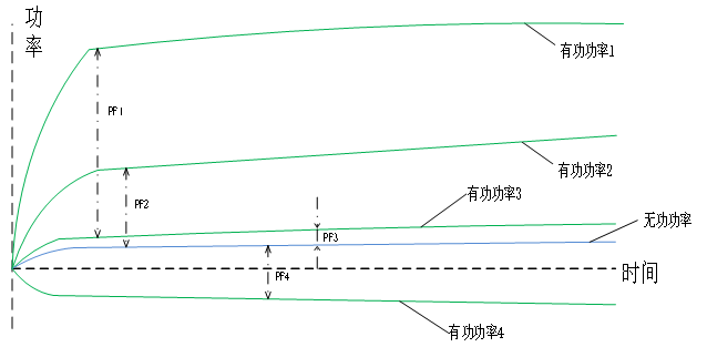 負載設備用電功率不變,隨著分布式光伏發電系統發電功率的逐步上升,同時電網側進線柜的有功功率會逐步下降,甚至出現分布式光伏發電系統倒送有功功率上電網的情況,所以在此情況下,不同階段的電網進線柜功率因數(PF1>PF2>PF3>PF4)越來越小。