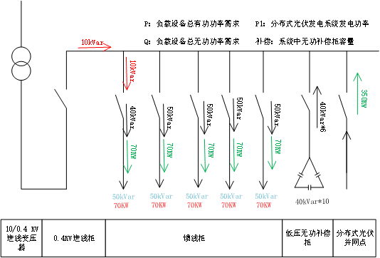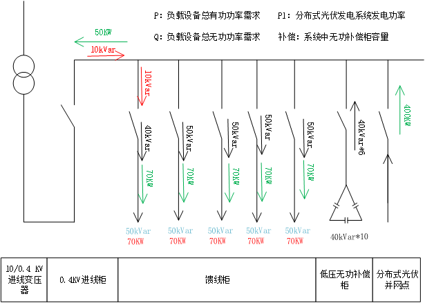 當設備運行時,則在市電進線柜,光伏發電系統反向倒送有功功率50KW,用電負載由市電提供無功功率,無功功率經過補償柜補償后,市電提供無功功率10kVar,